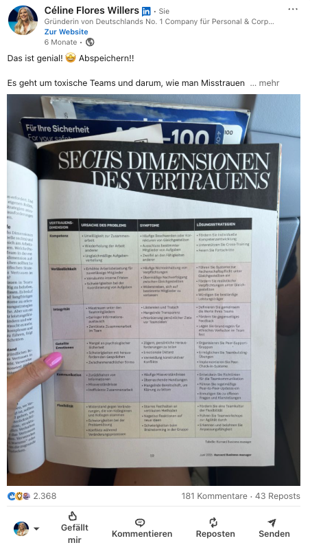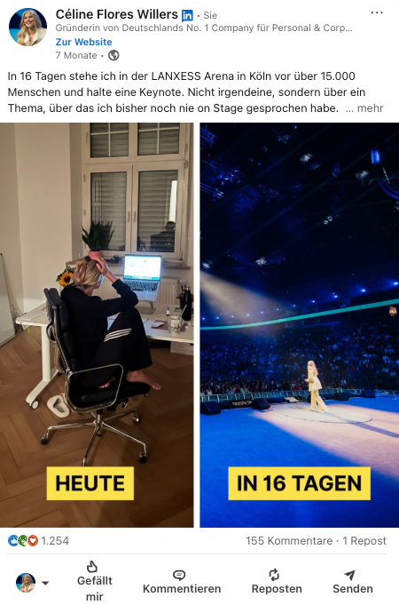 „Vor 8 Jahren habe ich angefangen, mir auf LinkedIn meine Personal Brand aufzubauen. Am Anfang war ich nur mit knapp 300 Kontakten verbunden. Heute erzielen meine Postings im Schnitt mehr als 200.000 Ansichten und es folgen mir mehr als 215.000 Professionals. In meinem E-Learning nehme ich unter anderem einzelne Postings auseinander und erkläre, warum etwas gut funktioniert – und auch was überhaupt nicht läuft. Ich teile mit euch die Expertise, die ich mir selbst über viele Jahre hinweg angeeignet habe.“